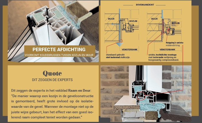 Hans vervolgt: ‘Mensen vragen vaak waarom Knipping geen stelkozijnen gebruikt. Andere leveranciers doen dat wel. Een goede isolatie begint juist met de aansluting van het kozijn of deur tegen de muur. Hoe beter dit luchtdicht en koudebrugvrij aansluit, hoe beter de isolatiewaarde daadwerkelijk is. Daarom passen wij geen stelkozijnen (met aanslagen) toe. Wij monteren nauw tegen de muur en dichten af met een zeer hoogwaardige kwaliteit compressie band en een afdichting (verlijming) met 2-componenten schuim voor een perfecte thermische en akoestische afdichting.